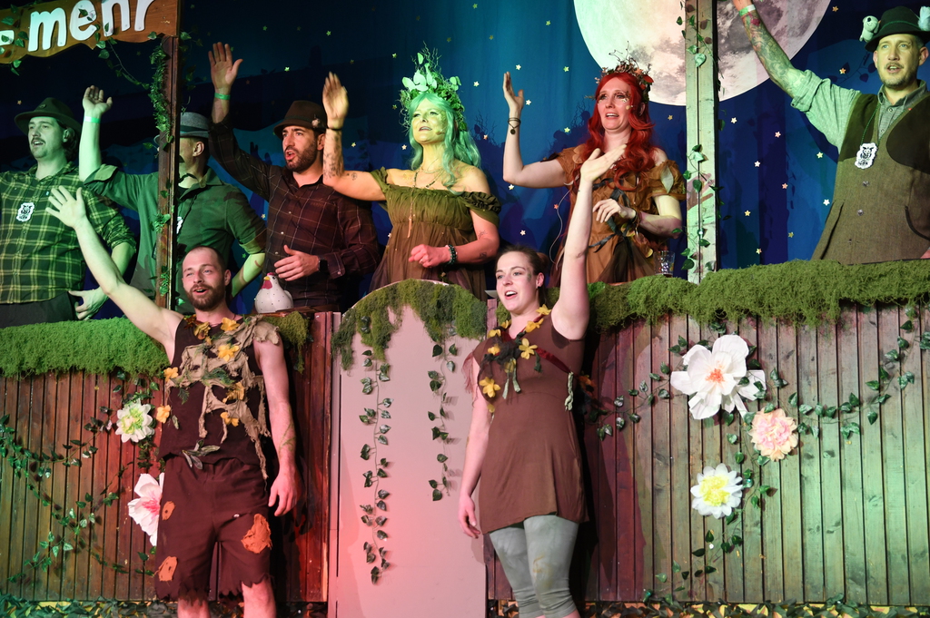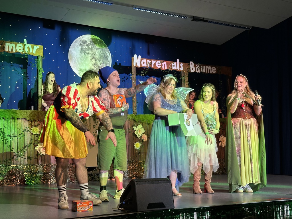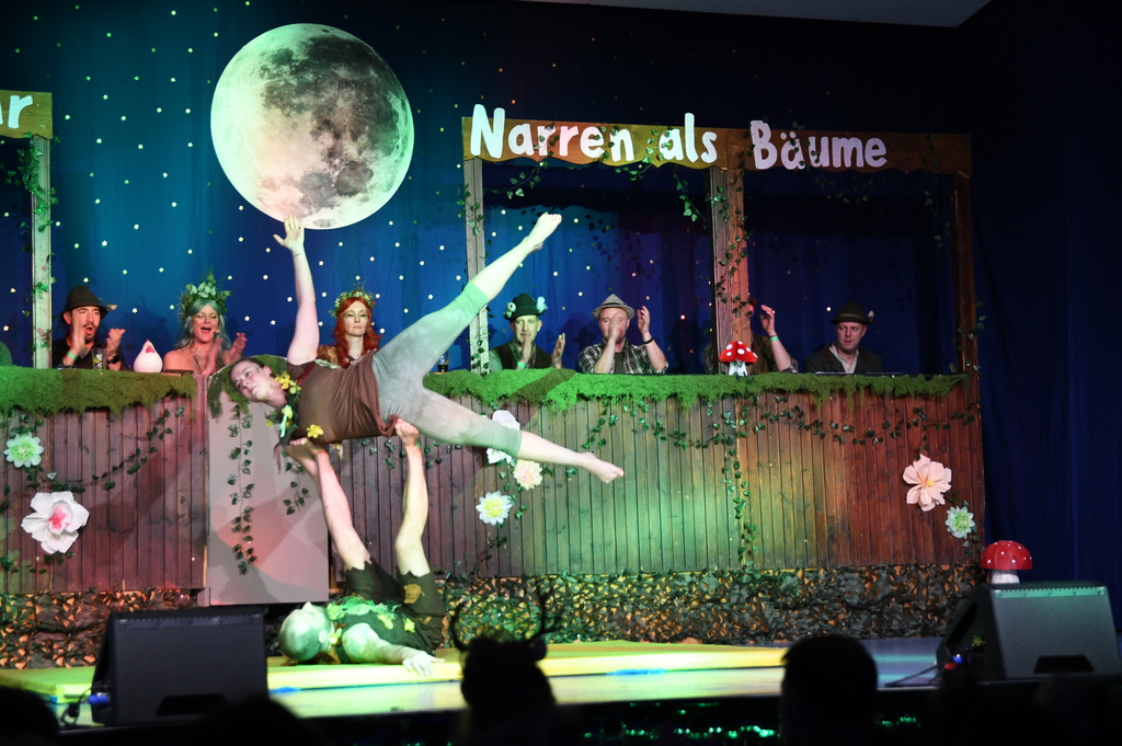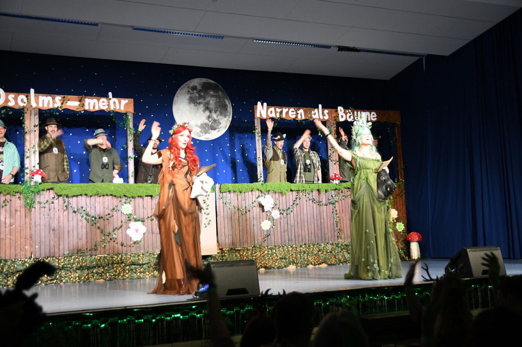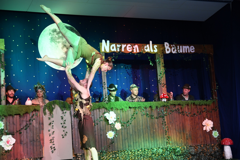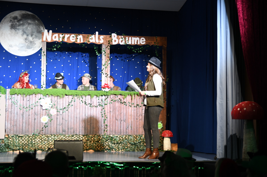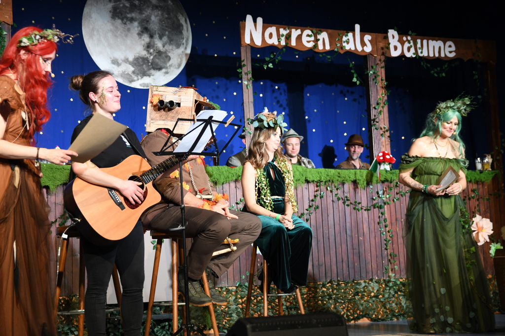 Eröffnet wurde die Prunksitzung durch die Jagdhornbläser Matias und Silvan, die immer wieder auch neue Programmpunkte ankündigten. Die Show startete mit einer wilden Verfolgungsjagd, bei der der Elferrat seine TreffUNsicherheit unter Beweis stellte, ehe sich der Vorhang öffnete und die Sitzungspräsidentinnen Christine und Christin putzmunter als Waldfeen auf der Bühne erschienen.