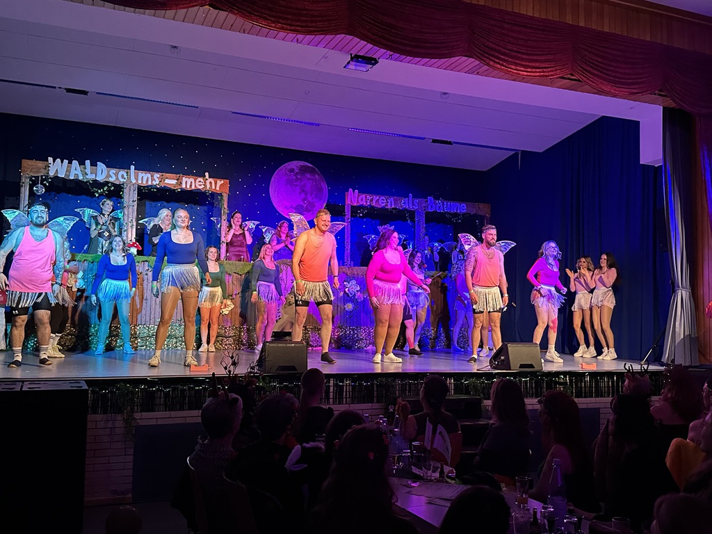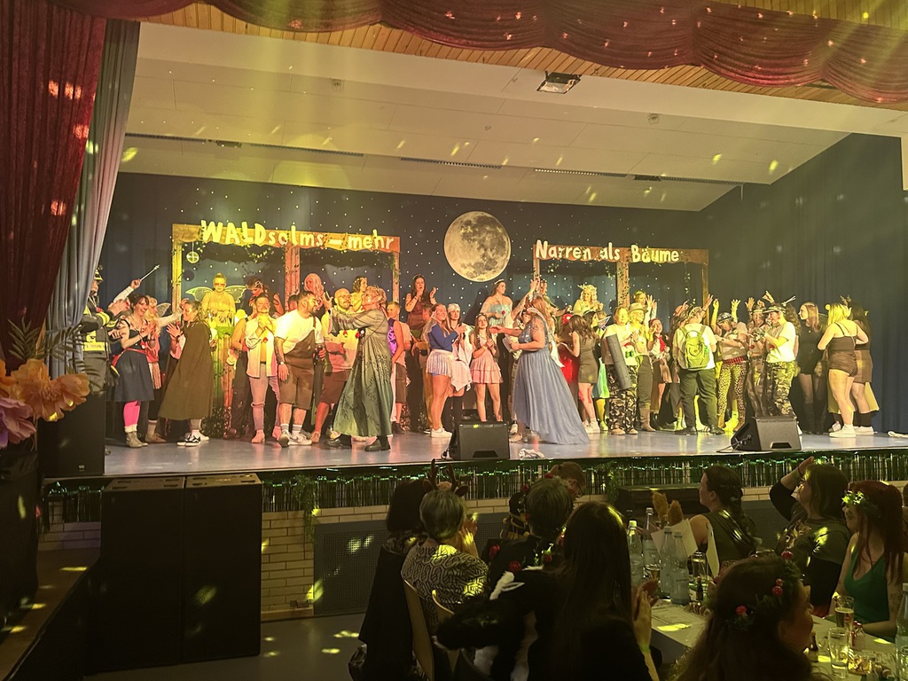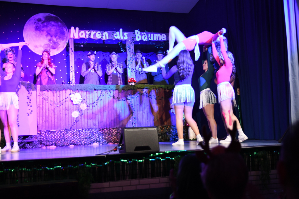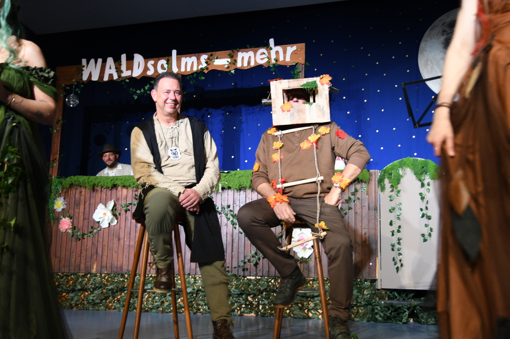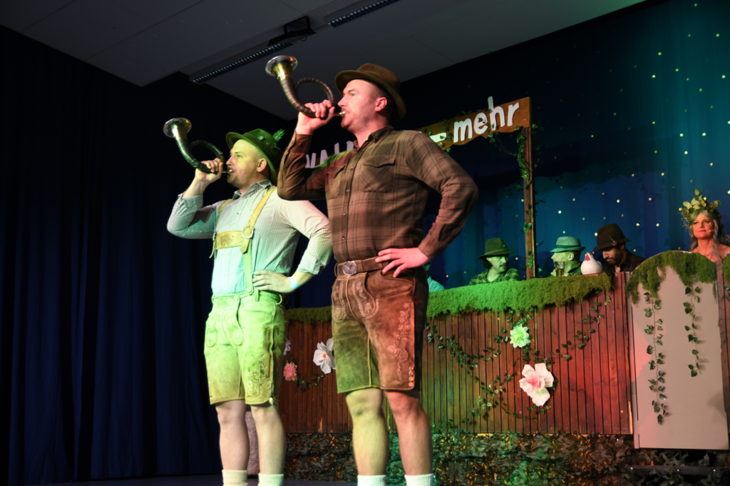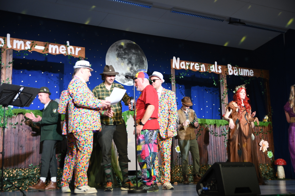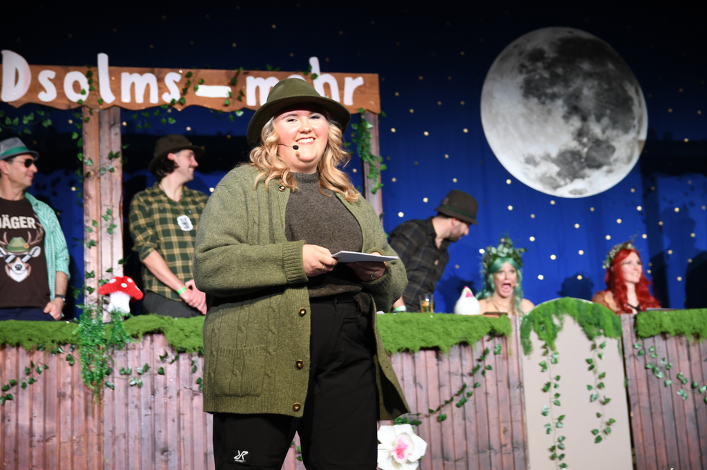 Eröffnet wurde die Prunksitzung durch die Jagdhornbläser Matias und Silvan, die immer wieder auch neue Programmpunkte ankündigten. Die Show startete mit einer wilden Verfolgungsjagd, bei der der Elferrat seine TreffUNsicherheit unter Beweis stellte, ehe sich der Vorhang öffnete und die Sitzungspräsidentinnen Christine und Christin putzmunter als Waldfeen auf der Bühne erschienen.