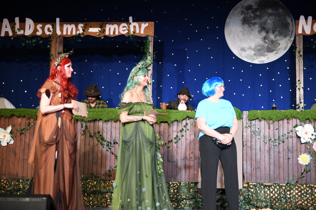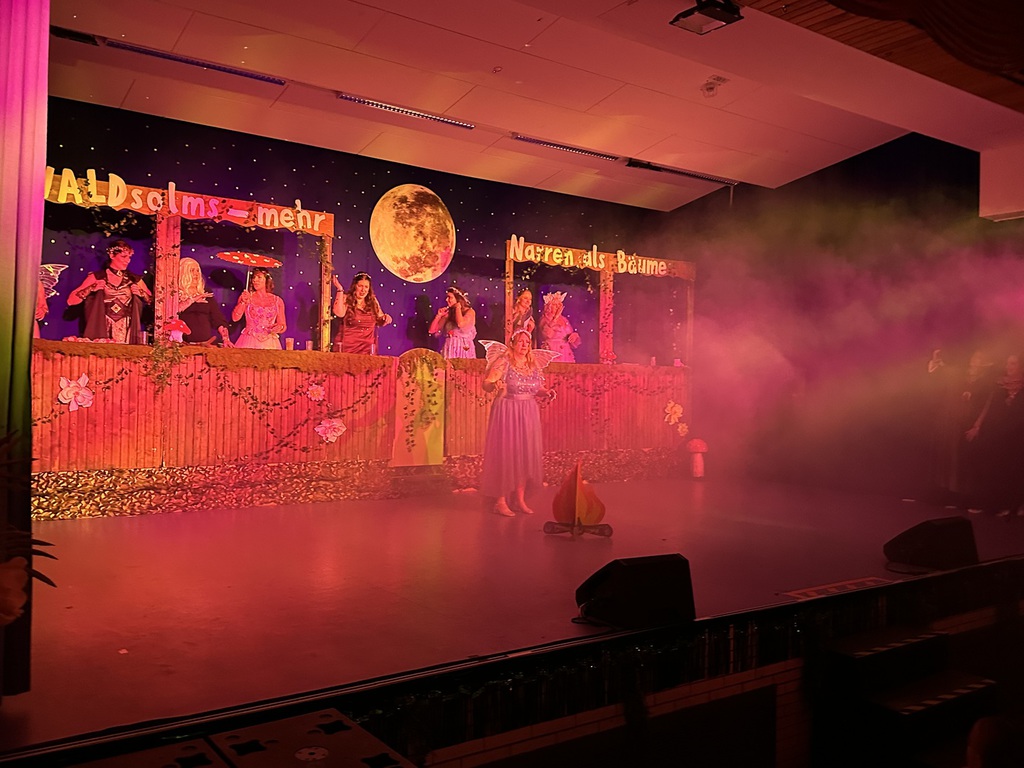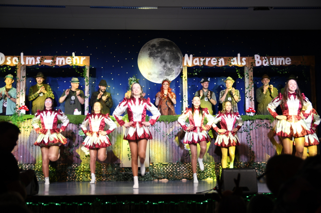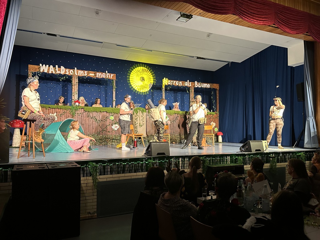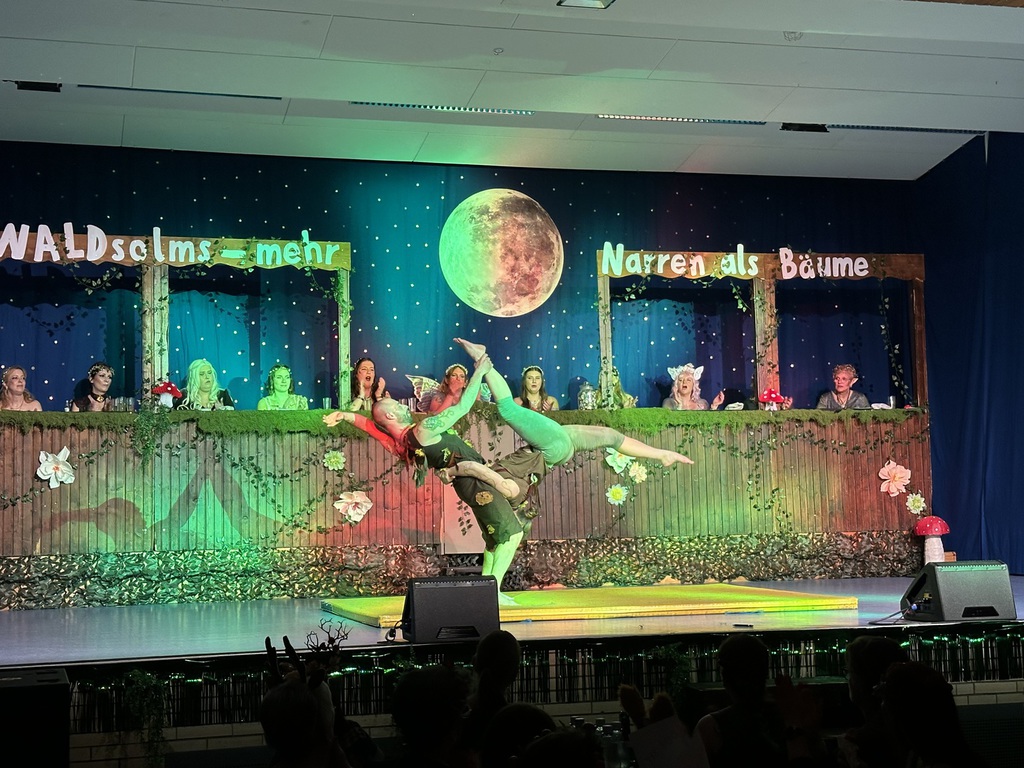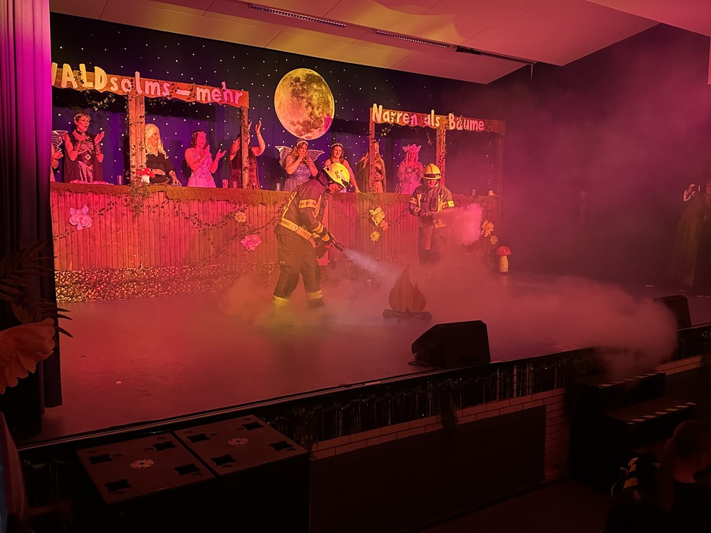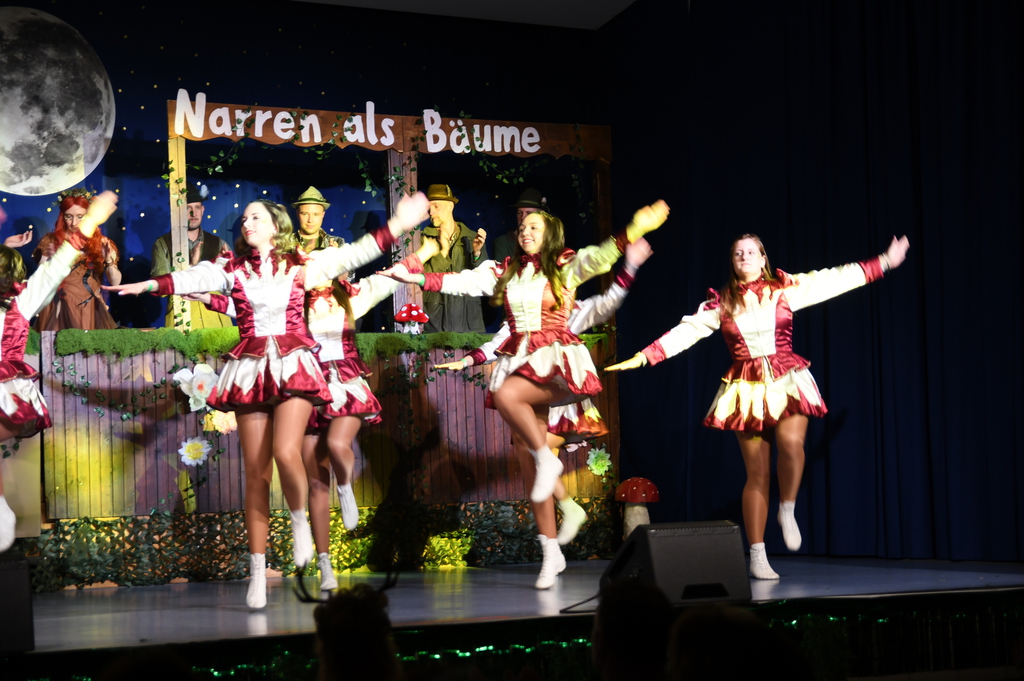 Eröffnet wurde die Prunksitzung durch die Jagdhornbläser Matias und Silvan, die immer wieder auch neue Programmpunkte ankündigten. Die Show startete mit einer wilden Verfolgungsjagd, bei der der Elferrat seine TreffUNsicherheit unter Beweis stellte, ehe sich der Vorhang öffnete und die Sitzungspräsidentinnen Christine und Christin putzmunter als Waldfeen auf der Bühne erschienen.