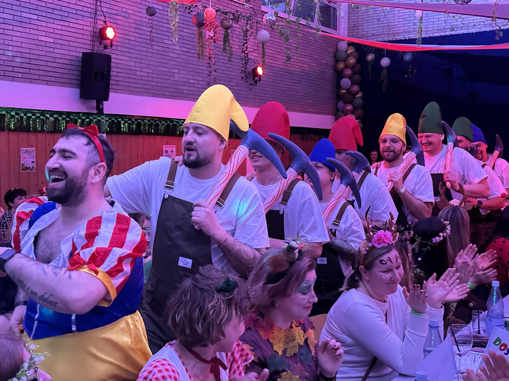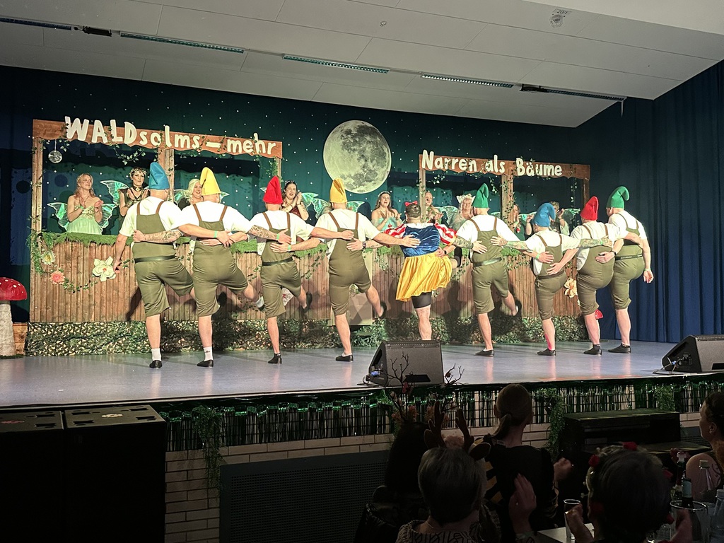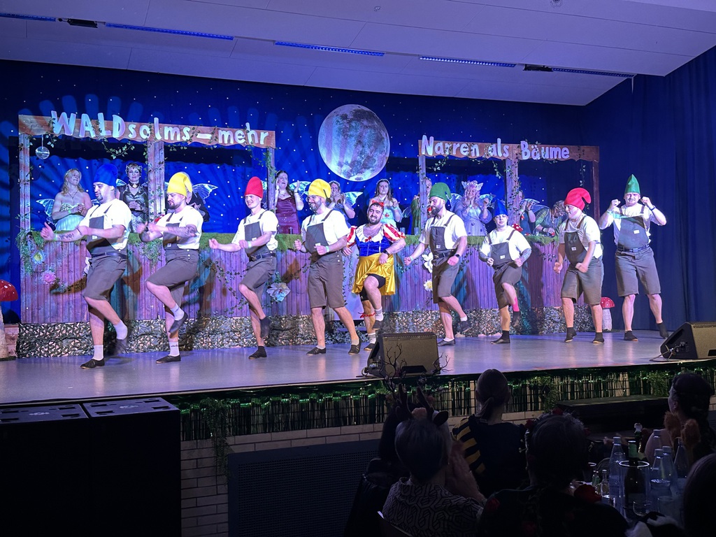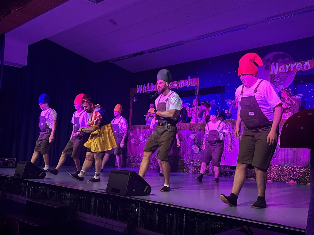 Passend dazu zogen anschließend acht Zwerge und ein Schneewittchen durch den Saal auf die Bühne ein. Das Männerballett Ballerhinos brachten die Bühne zum Beben.